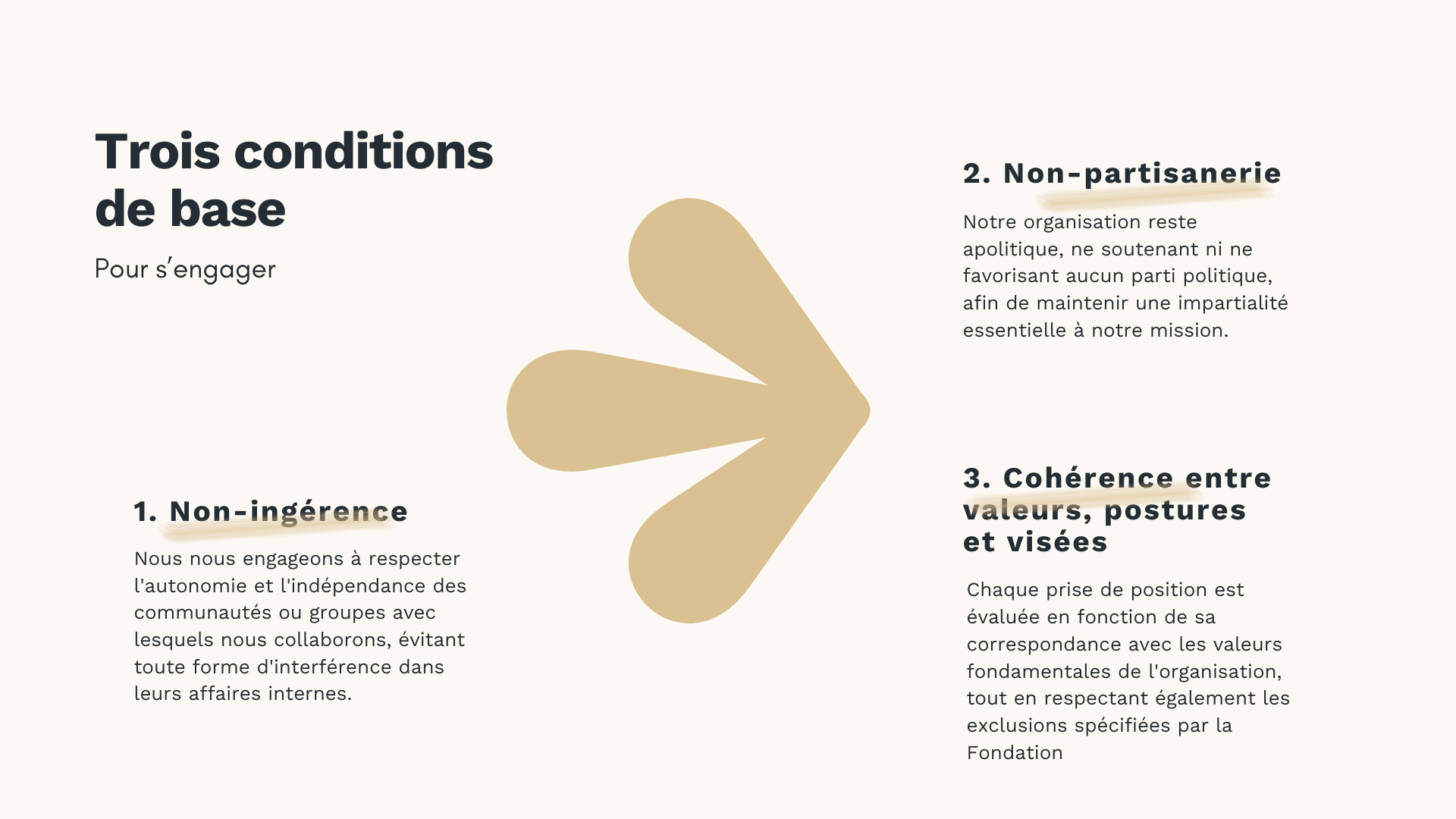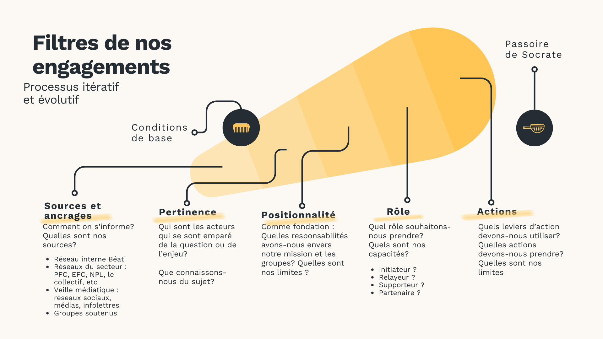 Engagement / À propos / Engagement Ancré dans la justice du vivant, notre engagement s’étend au-delà du financement. Nous soutenons les communautés en action à travers un appui financier, un accompagnement lorsque demandé et une veille stratégique pour assurer que nos investissements sont en cohérence avec notre mission. Nous reconnaissons que notre voix peut être un levier important pour les luttes. Ainsi, nous prenons position sur des enjeux majeurs, en réponse aux demandes des groupes que nous soutenons, en s’ancrant dans notre responsabilité liée à notre position et en exerçant notre devoir de solidarité. Notre cadre d’engagement Nous avons établi un cadre de l’engagement qui guide nos prises de position et notre implication. Ce cadre définit nos principes, nos critères d’intervention et notre processus décisionnel. Il vise à assurer que nos engagements restent cohérents avec notre mission et les besoins des communautés avec lesquelles nous travaillons. Prises de position Depuis plusieurs années, nous avons pris position et agi concrètement sur divers enjeux sociaux, économiques et environnementaux. Nos engagements se manifestent de différentes façons : appui public aux démarches des groupes, signature de lettres ouvertes et de pétitions, participation à des rassemblements et manifestations, et, lorsque nécessaire, révision de nos investissements. Ces actions témoignent de notre volonté d’amplifier les voix des groupes que nous soutenons et de contribuer activement à des transformations structurelles. 20 mars 2026 La Fondation Béati exprime sa pleine et entière solidarité solidarité envers les organismes communautaires à travers le Québec, qui se mobilisent actuellement dans le cadre du mouvement « Le communautaire à boutte! » dans un contexte de sous-financement chronique et de pressions structurelles accrues sur le filet social. Jour après jour, ces organismes maintiennent un filet social essentiel, souvent avec des ressources insuffisantes. Et d’année en année, les besoins augmentent, les équipes s’épuisent, et les perspectives d’amélioration demeurent incertaines. La mobilisation actuelle, incluant la grève annoncée du 23 mars au 2 avril, témoigne d’une situation intenable. Nous reconnaissons que notre société repose largement sur la force, l’expertise et l’engagement du milieu communautaire. Dans un contexte où l’État se désengage de ses responsabilités sociales et reporte une pression croissante sur le milieu communautaire, il est d’autant plus indispensable de rappeler que le financement adéquat, la reconnaissance et la pérennité du communautaire relèvent d’abord et avant tout de la responsabilité de l’État. Comme Fondation, nous refusons de nous substituer à ce rôle, tout en reconnaissant notre responsabilité d’agir de manière cohérente et engagée. Cela implique notamment de : Renforcer notre soutien au financement sans restriction, pour permettre aux organismes de déployer leur action selon leurs priorités ; Alléger les exigences administratives et les mécanismes de reddition de comptes, afin que les ressources soient consacrées là où elles ont le plus d’impact ; Reconnaître pleinement l’autonomie des organismes et leur expertise ancrée dans les réalités des communautés ; Contribuer, à notre échelle, à des conditions plus justes et soutenables pour celles et ceux qui portent ce travail essentiel. Nous reconnaissons pleinement et appuyons les revendications portées par le mouvement : des conditions de travail décentes, un financement suffisant et stable, une reconnaissance pleine et entière, ainsi que la protection de l’autonomie du communautaire. Nous réitérons notre engagement à nous tenir activement et durablement aux côtés du milieu communautaire en assumant pleinement notre rôle et nos responsabilités. Parce qu’un filet social solide ne peut reposer sur l’épuisement de celles et ceux qui le portent. Pour soutenir le mouvement ou se mobiliser : https://aboutte.info/ Fondation Beati 2 mars 2026 La Fondation signe le manifeste pour un Québec sans pauvreté qui réclame au gouvernement du Québec la mise en place de politiques publiques visant à améliorer en priorité les conditions de vie des personnes en situation de pauvreté. Fondation Beati Réseaux communautaires Nous croyons en la force des alliances et collaborations pour renforcer les luttes sociales et environnementales. C’est pourquoi nous rejoignons des réseaux alignés avec nos valeurs, en fonction des besoins et des dynamiques des luttes en cours et qui concernent les groupes que nous soutenons. Ces engagements se font avec la conviction qu’une philanthropie responsable, engagée et solidaire est un levier essentiel pour une société plus juste et équitable.
