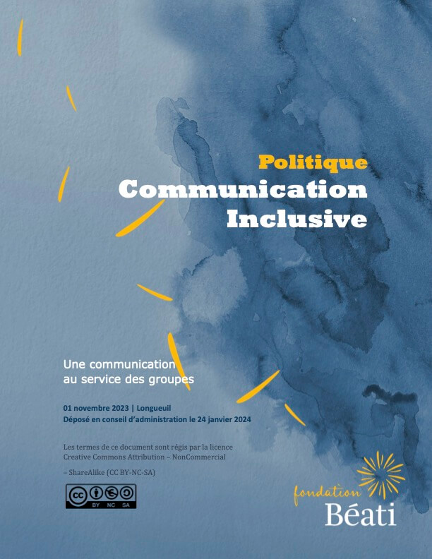 Politique Politique communication inclusive Publié: mai 2, 2025 En adoptant une approche de communication inclusive, nous créons des espaces où chacun·e se sent respecté·e, valorisé·e et représenté·e. C’est un processus de construction d’égalité, de rupture des barrières et de promotion du dialogue inclusif. Cela nécessite le développement de compétences, l’écoute active, la valorisation des expériences des autres et l’ouverture à de nouvelles perspectives. Télécharger Politique communication inclusive / Ressources / Politique communication inclusive