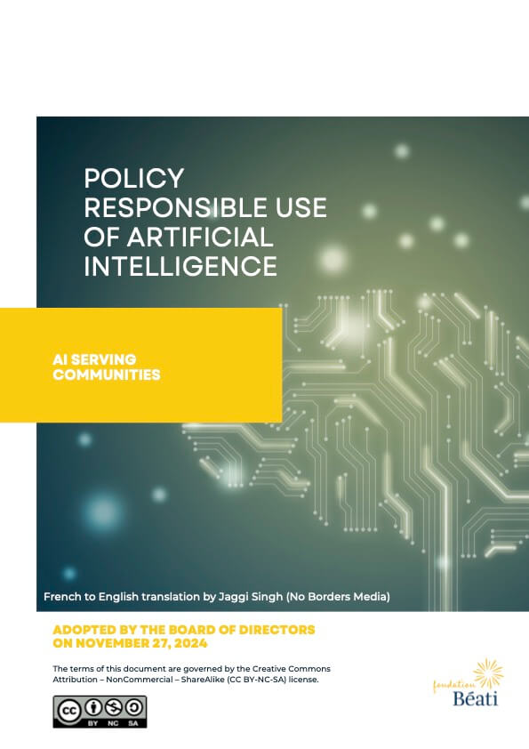 Politique Responsible Use of Artificial Intelligence Publié: octobre 1, 2025 This policy for the responsible use of AI is designed with a keen awareness of our responsibilities as stakeholders in the philanthropic sector, eager to put the needs of the groups we support at the forefront of our action. Télécharger / Ressources / Responsible Use of Artificial Intelligence In today’s digital age, where technology is evolving at a dizzying pace, artificial intelligence (AI)represents both an extraordinary promise of progress, and a complex maze of ethical, social, andpolitical challenges. For a philanthropic foundation committed to supporting marginalizedcommunities and groups, the adoption and use of AI raise fundamental questions about how wecan honor our mission while navigating this changing technological landscape.
