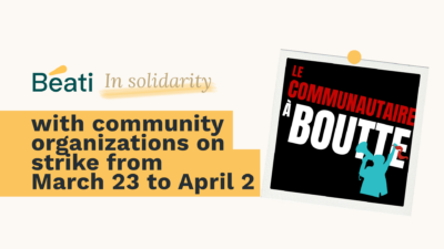 Beati Foundation expresses its full and unequivocal solidarity with community organizations across Quebec that are currently mobilizing as part of the “Le communautaire à boutte!” movement, in a context of chronic underfunding and increasing structural pressures on the social safety net. Day after day, these organizations sustain an essential social safety net, often with insufficient resources. Year after year, needs continue to grow, teams are exhausted, and prospects for improvement remain uncertain. The current mobilization, including the strike announced from March 23 to April 2, reflects an untenable situation. We recognize that our society relies heavily on the strength, expertise, and commitment of the community sector. In a context where the state is withdrawing from its social responsibilities and shifting increasing pressure onto community organizations, it is all the more essential to reaffirm that adequate funding, recognition, and the long-term sustainability of the community sector are прежде and foremost the responsibility of the state. As a Foundation, we refuse to substitute for this role, while acknowledging our responsibility to act in a coherent and committed manner. This includes, in particular: Strengthening our support for unrestricted funding, to enable organizations to carry out their work according to their own priorities; Reducing administrative requirements and reporting mechanisms, so that resources can be directed where they have the greatest impact; Fully recognizing the autonomy of organizations and their expertise rooted in the realities of their communities; Contributing, within our means, to more just and sustainable conditions for those who carry out this essential work. We fully recognize and support the demands put forward by the movement: decent working conditions, sufficient and stable funding, full recognition, and the protection of community sector autonomy. These demands are legitimate. They are necessary. We reaffirm our commitment to stand actively and sustainably alongside the community sector, fully assuming our role and responsibilities. Because a strong social safety net cannot rest on the exhaustion of those who uphold it. To support or join the movement: https://aboutte.info/